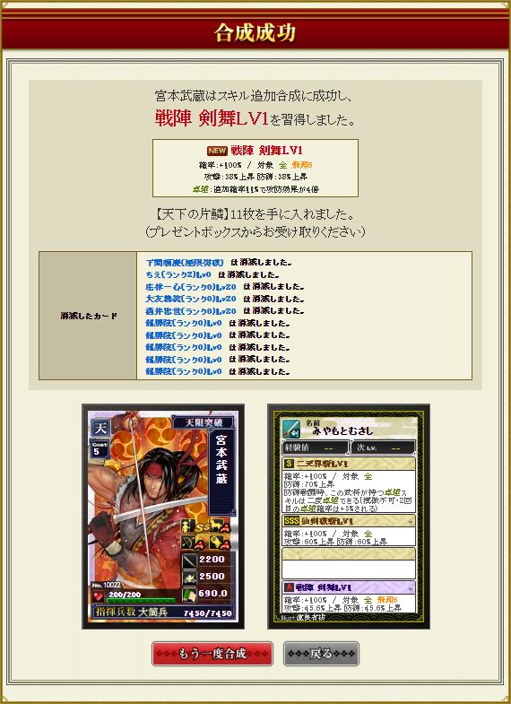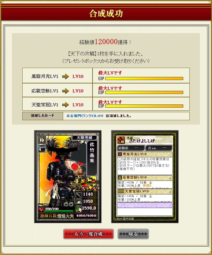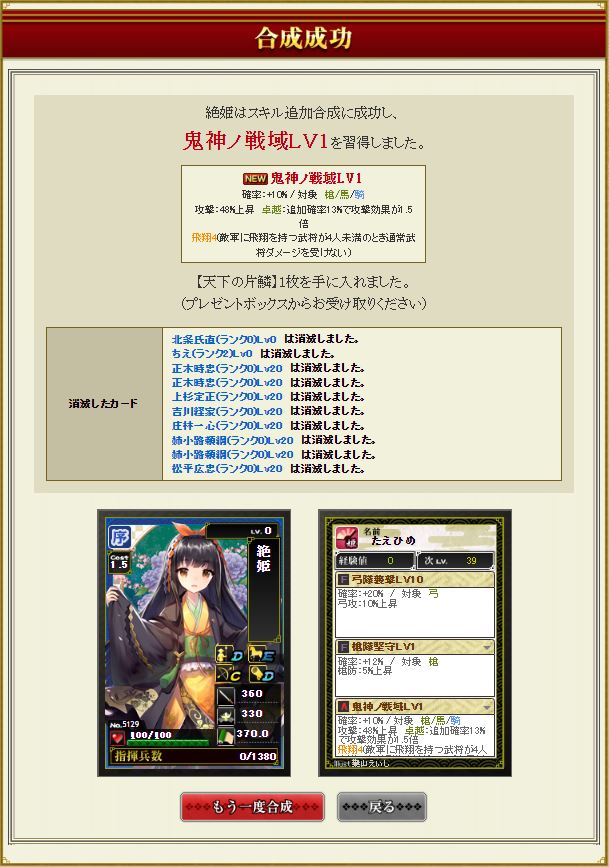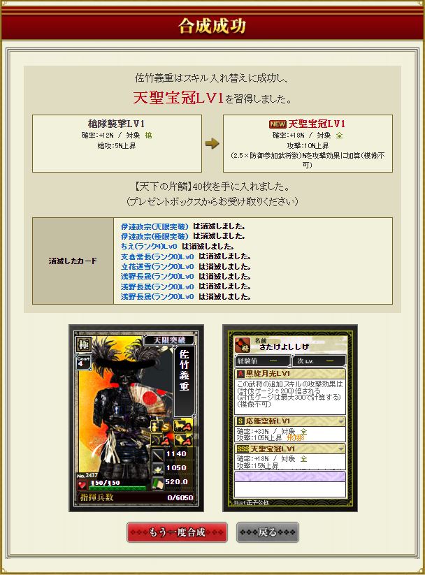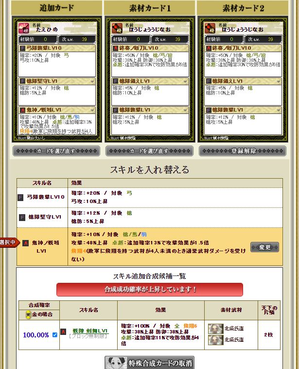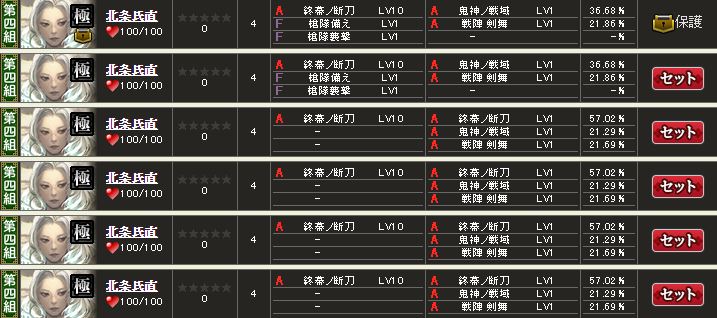 佐竹だけ飛びそうだけど開闢もう1つ付ければ往復できる部隊になるかな。とりあえず今川部隊長で期待値4億くらいの盟主戦部隊にはなった。