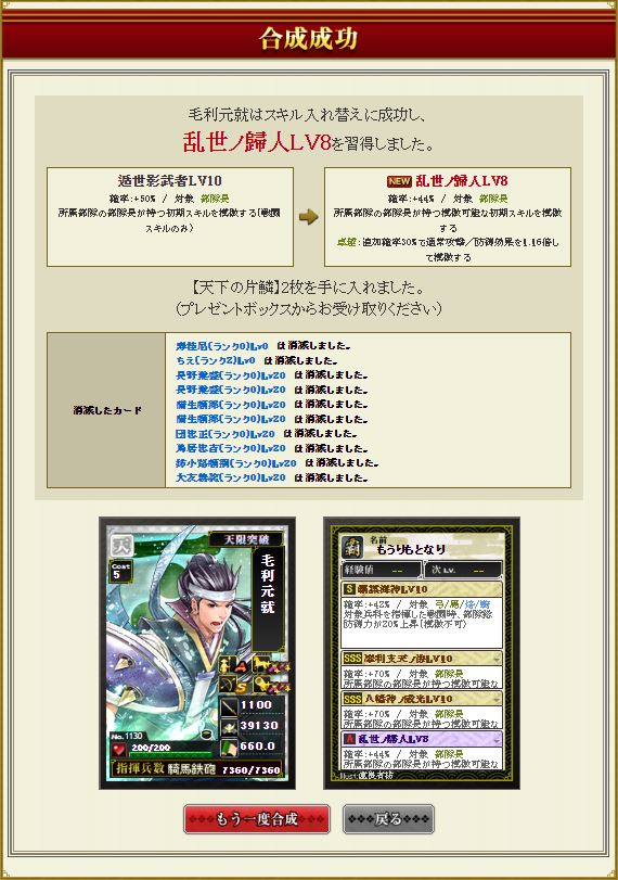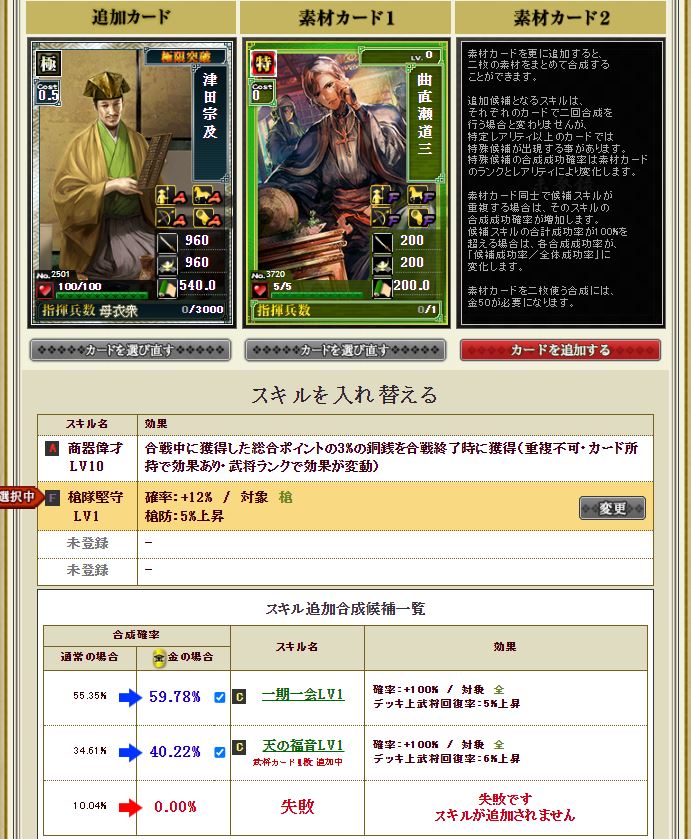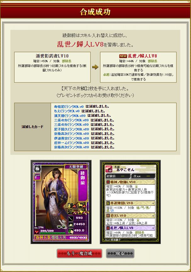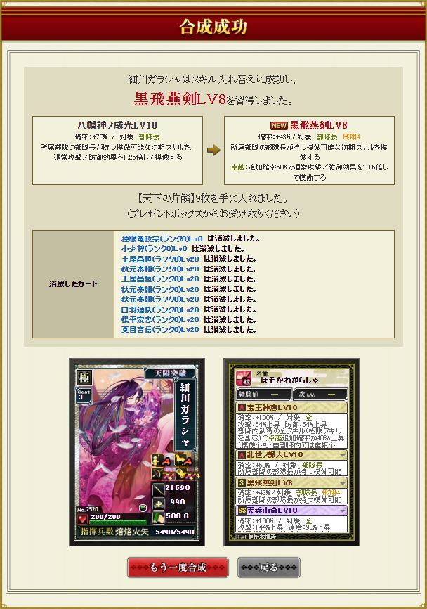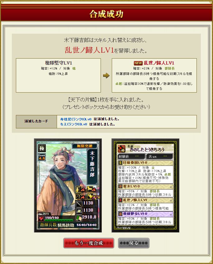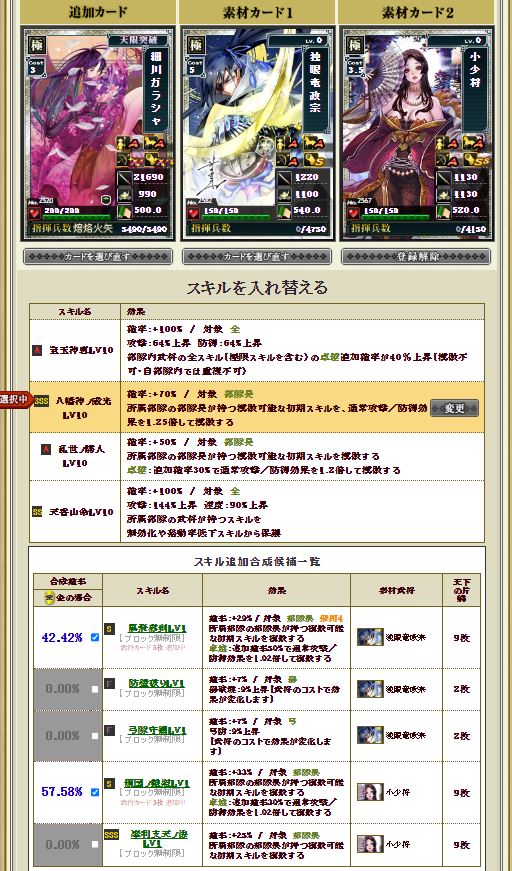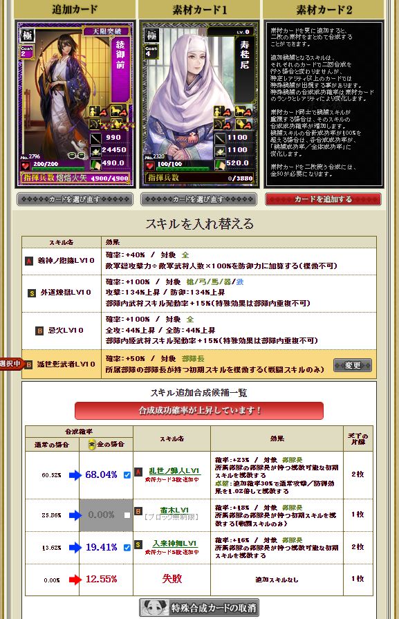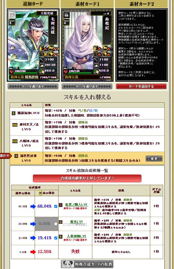 カシン異境で重宝する被害10%マシか、無鹿のそーりんさんか迷った結果がこれ。果たしてこいつで良かったかはさておき、1枚で確実に成功させねばというプレッシャーからなかなか合成ボタンを押せずにいる←