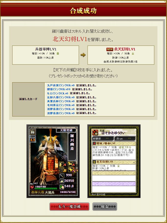 ついでに天カシン4.5コス要員として価値がポケカ並みに急騰したであろう2.5幽斎さん。本丸防衛ということで高火力の移植できるスキルが思い当たらず、安易に北天を付与w