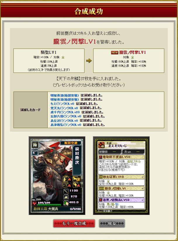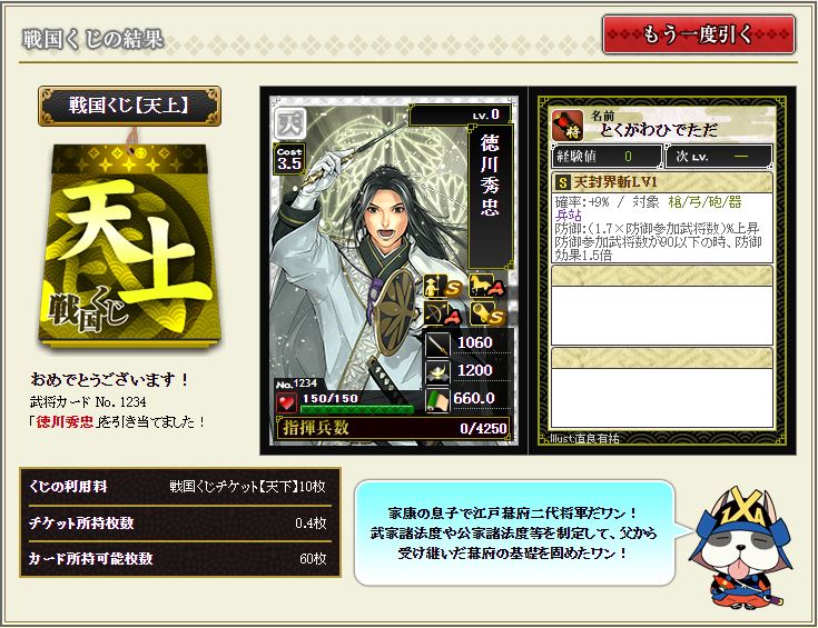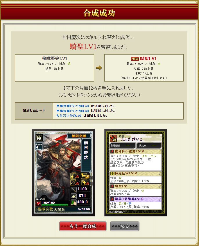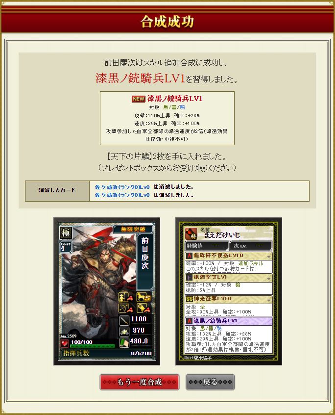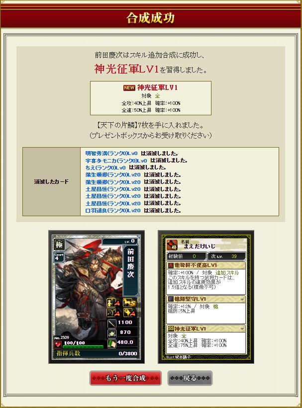 次に、先程慶次の育成過程でゲットした秀忠で2つめの盟主加勢部隊を作成。