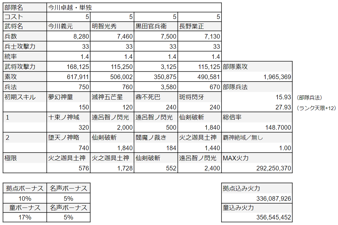 ボーナス込みでやっと3億超える程度なので、秘境大殿(今期あるの?w)とかソロ凸で使う部隊かな。ほぼ確でデバフ今川&浅井とか小次郎を食らう盟主戦では相当弱体化するからねw
