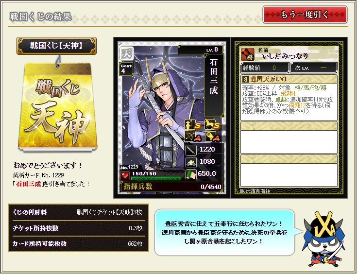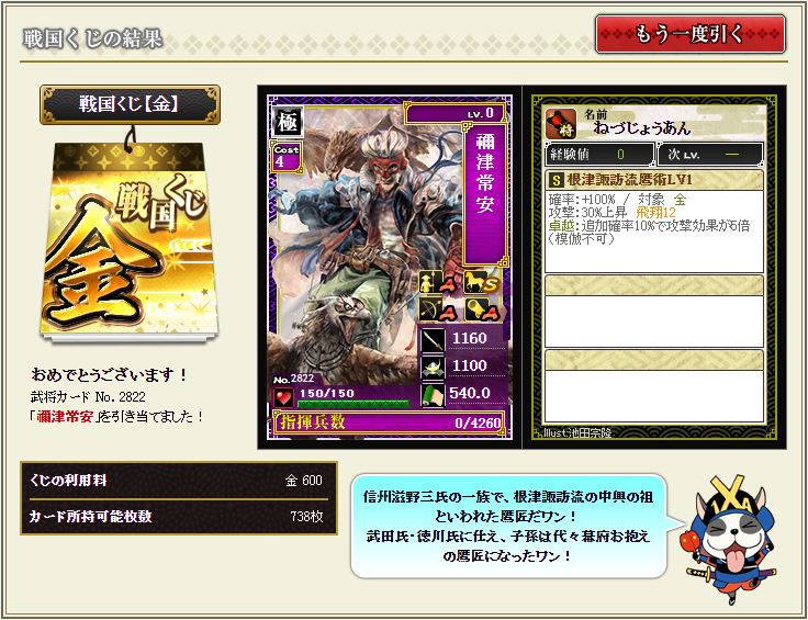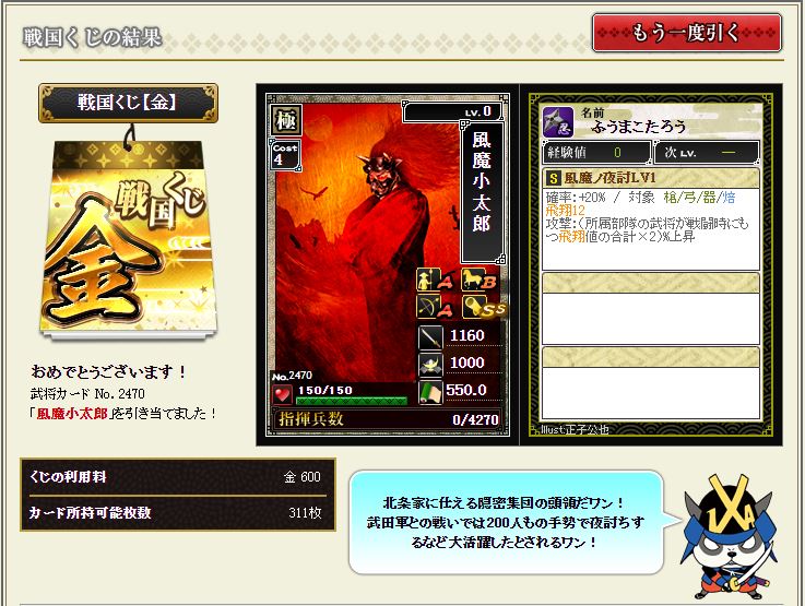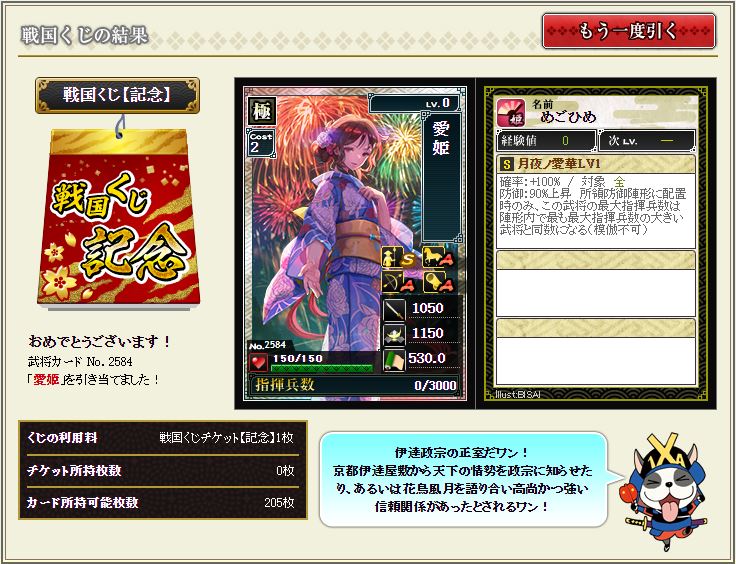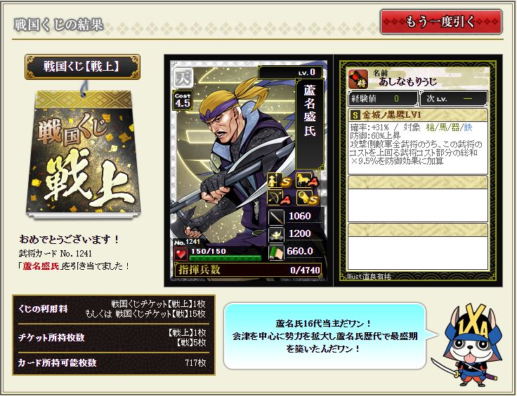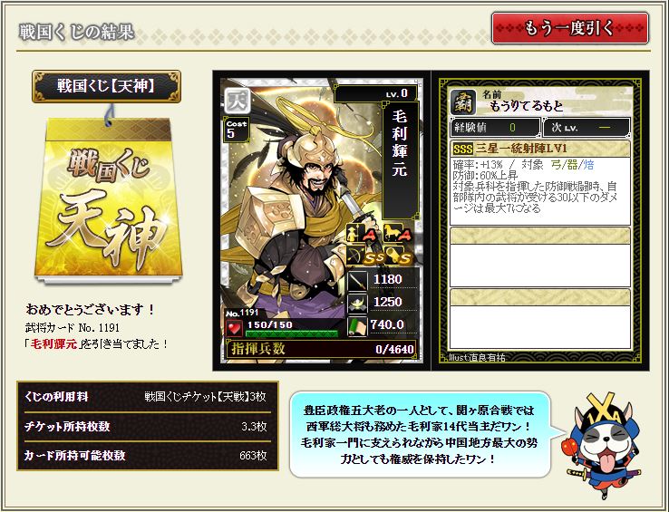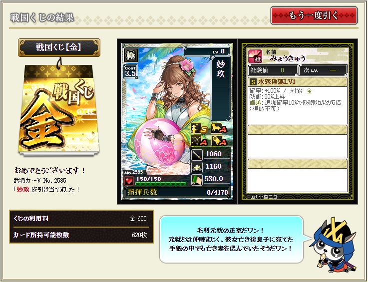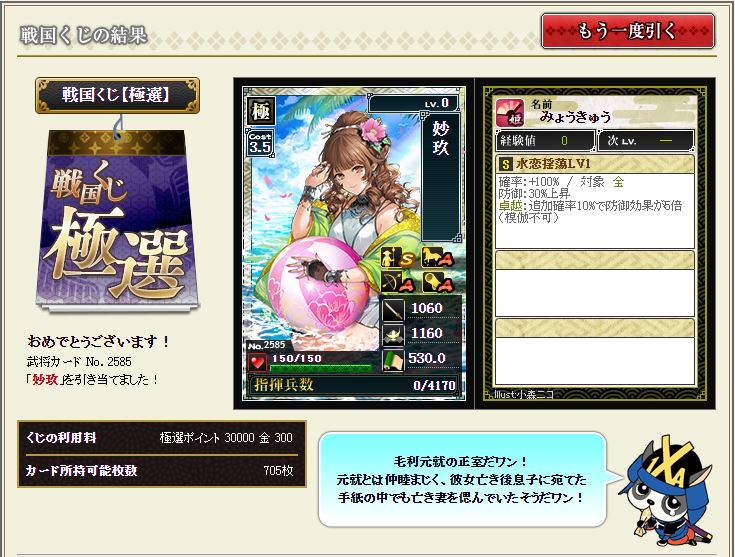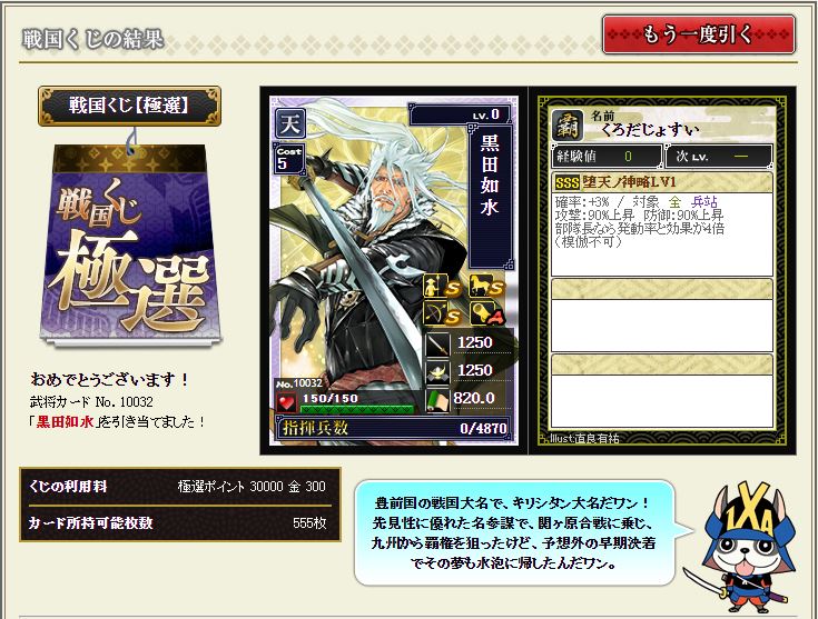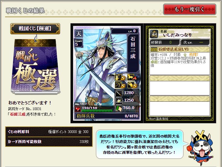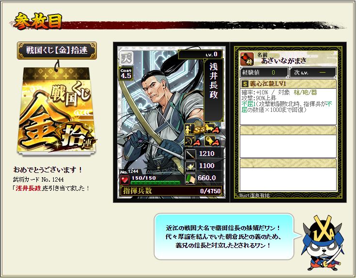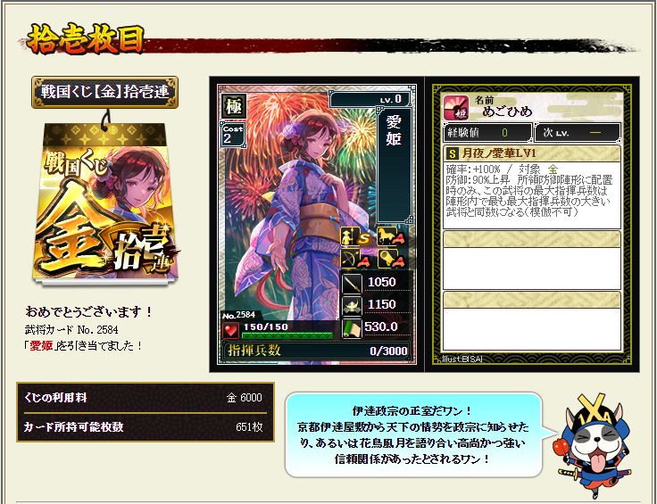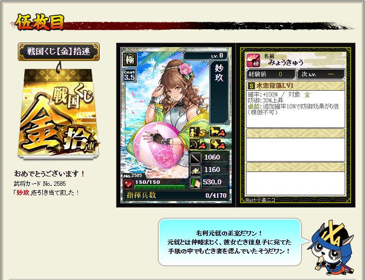 現状で武蔵を含む盟主加勢部隊の火力が3億後半から4億位なので、さらにこの子が火力アップしてくれるのではないかと、期待に胸が膨らむではないか^^