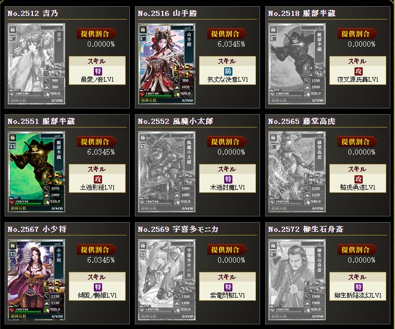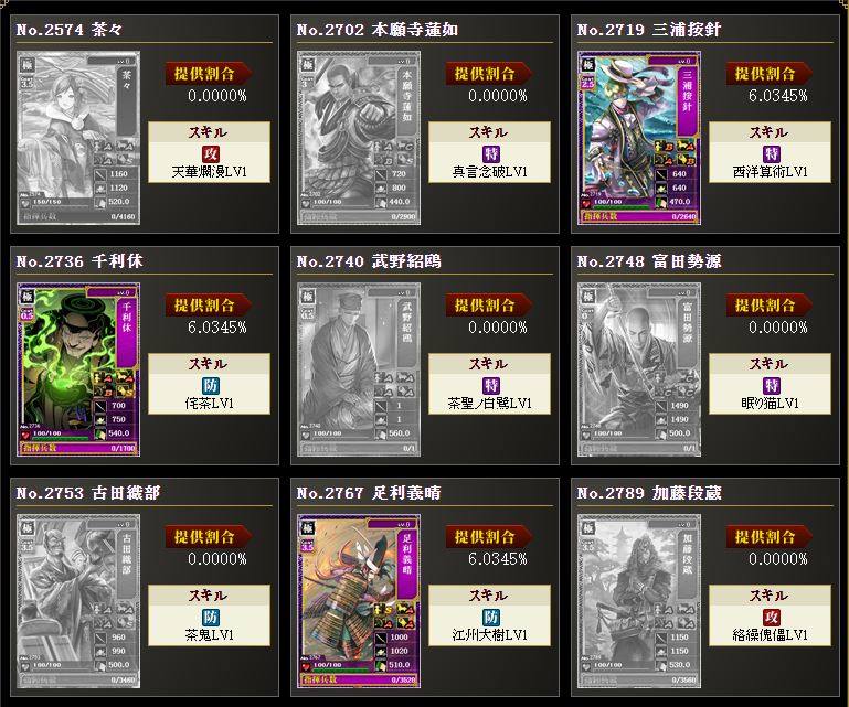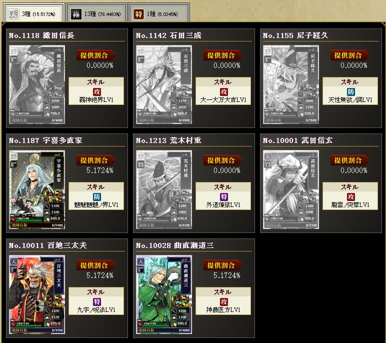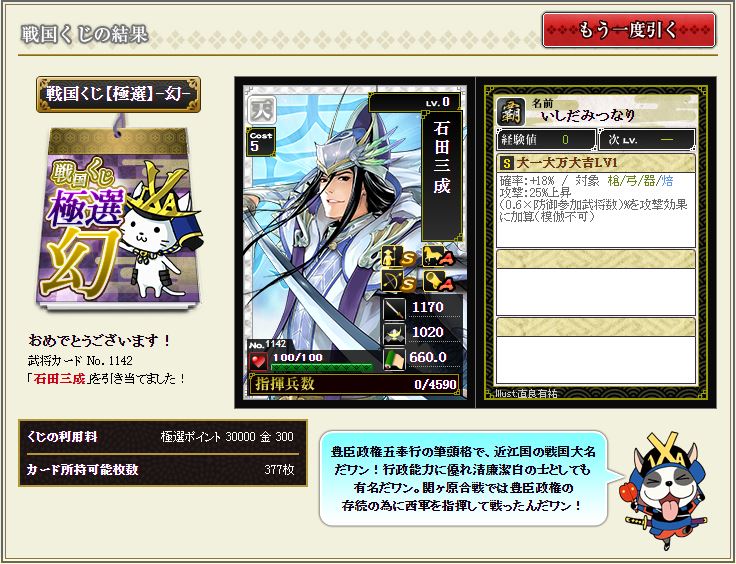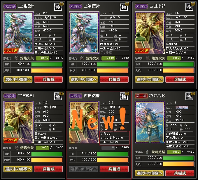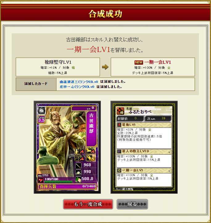 三成は盟主戦2軍ヘッドとして使っていたのを特殊合成で強化するため、こちらも旧版をラインナップして引き当てた。