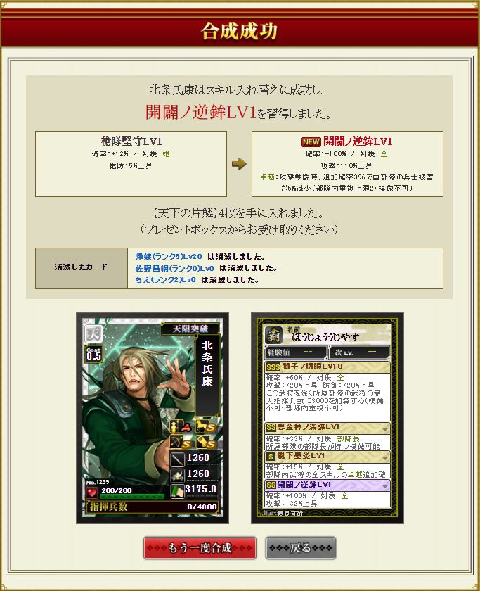 極限枠には氏康本人が跳ばないように開闢を。部隊内もしくは合流内で月詠があれば確定発動なので自合や、特に盟主戦の合流でも追撃出陣が可能に。
