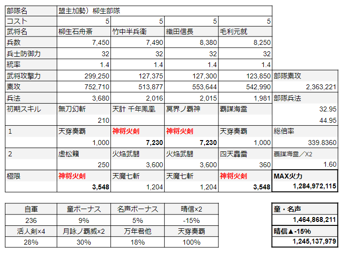 加勢部隊上限がしれっと増えました。スキルは移植できます。スキル発動・卓越発動は新Xスキルで確定できます。つまり、天柳生×大火力×全体アップの部隊構成が可能です。