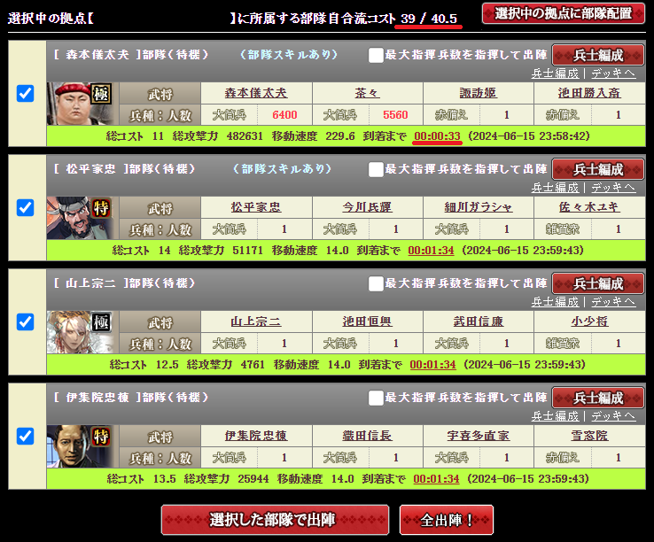 おにぎり好きなお相撲さん部隊は中入り速度で気付いた頃には時すでに遅しとさせる役割を(諏訪姫は3合流運用時の名残だけど悪屋形付いた2マネ0コスということで外さず使用)、松平と山上は4マネで15%の獲得率を最大限活かし、伊集院部隊の信長はコス消しや40.5コスに入るような0コス3マネ宇喜多などで構成。