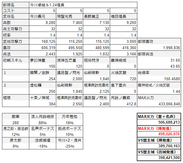 1位の今川に鍛錬が備わるのであれば武将攻撃力2.5倍が復刻になる前の3倍に、2位の果心はコス4.5が4に、5位の信長はぶっ壊れすぎないよう鍛錬Lv1ごとに0.5~1%アップずつというのが期待するイメージだろうか。