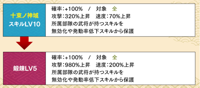 対象になる鍛錬可能な既存スキルは「十束の神域」「開闢の逆鉾」「遠呂智ノ閃光」の3つ。