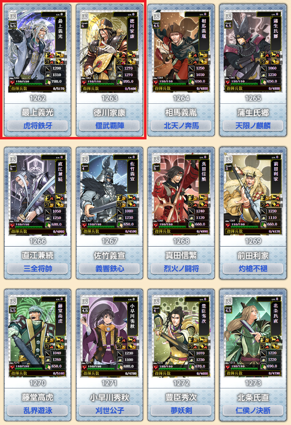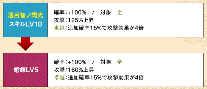 覇以外は強化してもコスパが悪くあまりオススメはできない。北条は一見悪くなさそうだけど、卓越発動は北条を鍛錬せずとも他でいくらでもより高い上昇率でカバーできる方法があるので、わざわざコスパの悪い鍛錬をする必要がない。