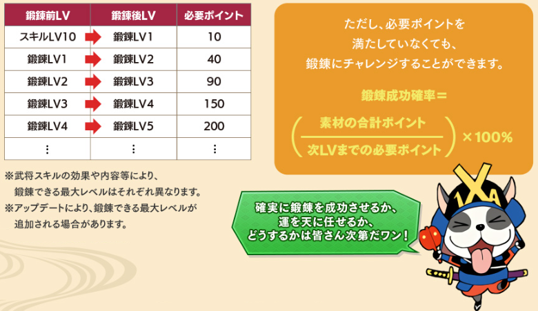新天はすべて鍛錬できる初期スキルを持っているが、覇以外は費やす素材に対して得られる強化の程度が低い。