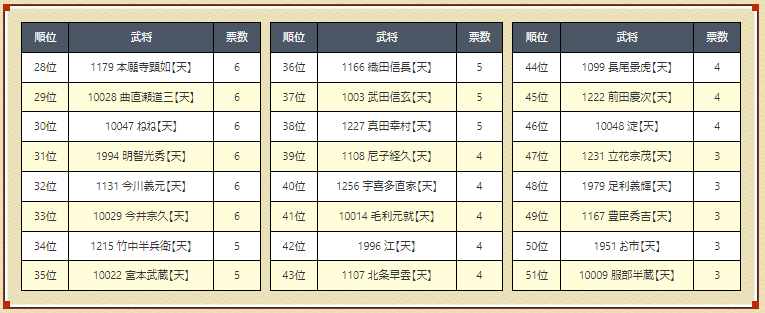 今期の新傑が引けない&引いても弱いため、既存では一番使われている1226伊達に意外な票が集まっている。1214クロカンは特殊効果(スキル発動&卓越発動アップ)部分への期待から、鍛錬の現状の傾向を感じ取った人の票が入っているということだろう。
