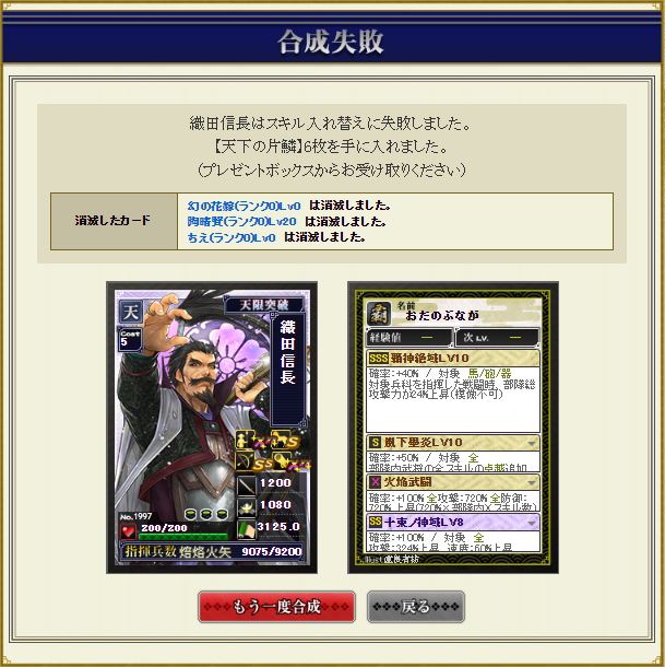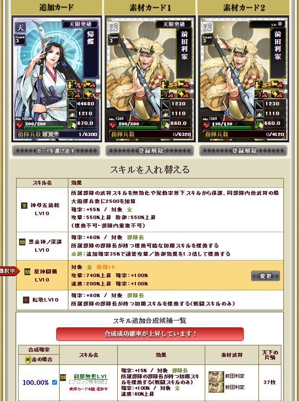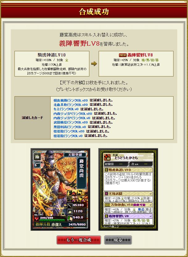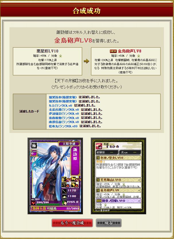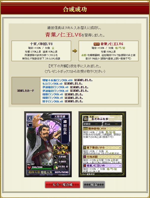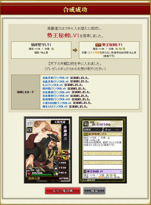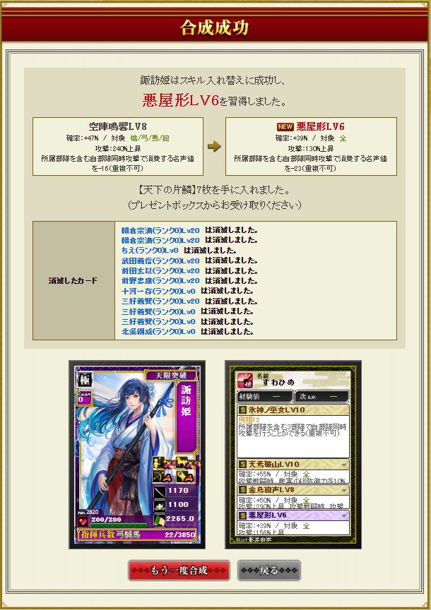 壊滅防止&覇道&速度&2マネという、個人的にけっこう使える1枚になった。ねねにお供させれば盟主戦の往復が可能になるし、和田にお供させればソロでも使える。