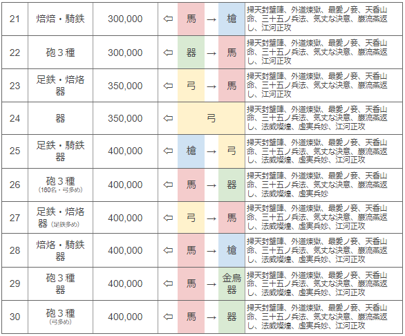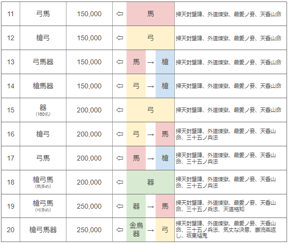 砦10も表の中に書いてはいるが、金烏が無くてもスキル枠が極限まで埋まった部隊があれば、兵科相性だけで簡単に攻略は可能だろう。