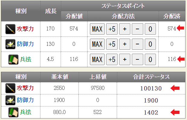 いわゆる嘘松(武将攻撃力の1%分を兵法に加算。上限は3,000)を使って3,000が加算されるくらいまででステ振りを調整すると、兵法値が4,402となり奇しくも「440」的な数値となる。