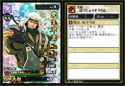 剣豪ではないので武将攻撃力はふつうではあるものの、通常枠最大2.6倍、極限枠が最大3.12倍になるのは通常天としてはあまりにもタガが外れすぎている。今期の当たりと言って良いこの北条早雲。各地の戦場で猛威を振るうことでしょう。