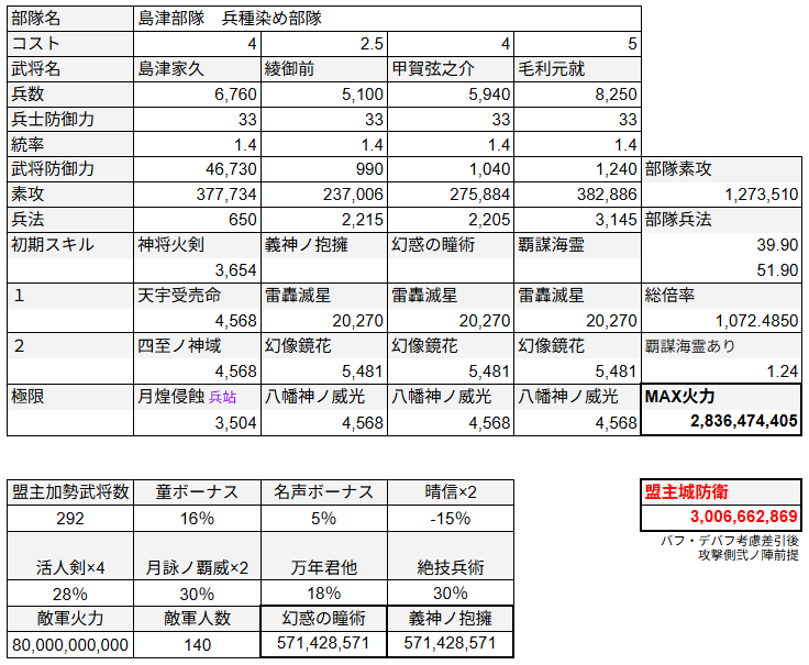 まずは、新Xスキルである雷轟滅星で強化した島津部隊の火力を計算してみます。